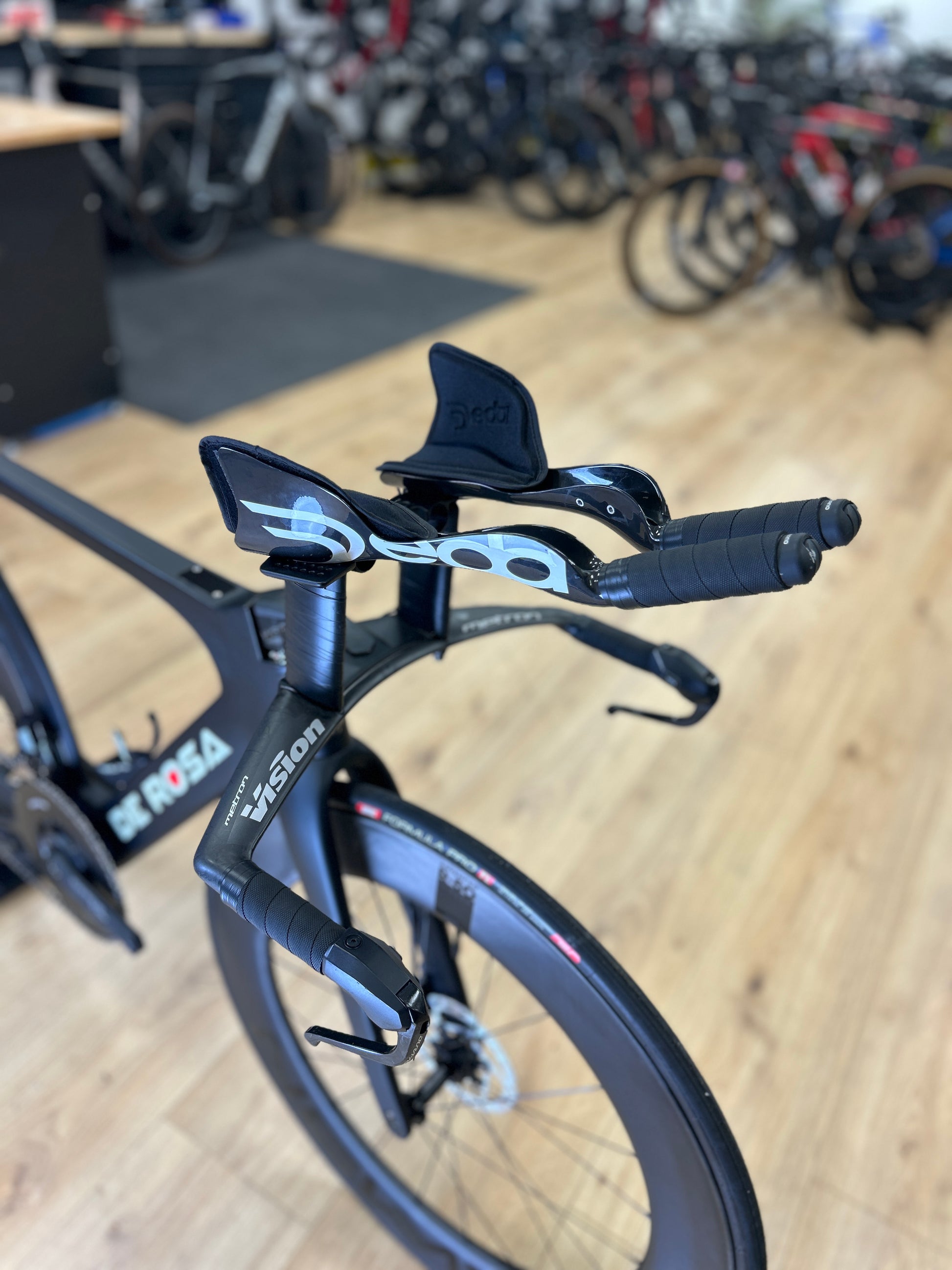 Dit is een aero-racefiets, ontworpen voor triatlons en tijdritten, waar elke seconde telt. Zijn carbon frame toont extreme aerodynamische optimalisatie die weerstand minimaliseert met behoud van een ergonomische zitpositie die nodig is voor maximale vermogensoutput over lange afstanden. Het merk De Rosa belichaamt de unie van Italiaans design-genie en hoogwaardige techniek, met oplossingen gesmeed in samenwerking met elite triatleten en tegen-de-klok-renners.